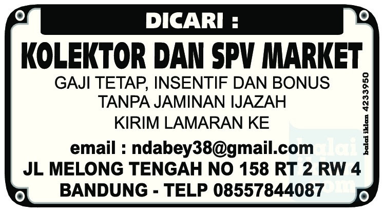 Yth. Pembaca Setia infolokerbandung.com terima kasih telah berkunjung ke http://ift.tt/28GLYGM, situs penyedia Informasi Lowongan Kerja Terbaru Bulan Agustus 2016. 'HATI-HATI' Terhadap Adanya Penipuan yang meminta sejumlah uang untuk proses REKRUITMENT! Semua proses REKRUITMENT yang kami informasikan tidak dipungut biaya apapun. Semoga apa yang kami informasikan dapat bermanfaat untuk anda semua